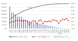 2025 年上半年,江蘇、浙江、廣東建筑業(yè)總產(chǎn)值均超過了1萬億元,分別達到15455.97億元、11393.61億元和11092.06億元,分別占全國建筑業(yè)總產(chǎn)值的11.30%、8.33%和8.12%。此外,總產(chǎn)值超過5000億元的還有湖北、山東、福建、四川、湖南、河南、安徽、北京共8個地區(qū),上述 11 省市完成的建筑業(yè)總產(chǎn)值占全國建筑業(yè)總產(chǎn)值的70.61%。從各地區(qū)建筑業(yè)總產(chǎn)值增長情況看,21個地區(qū)的建筑業(yè)總產(chǎn)值較上年同期都有不同幅度的增長。其中,海南的增幅最大,達到了15.79%。寧夏的增幅達到12.43%。10個地區(qū)的建筑業(yè)總產(chǎn)值較上年同期出現(xiàn)下降,其中北京、上海、廣西、內(nèi)蒙古的降幅均超過10%(圖 1)。