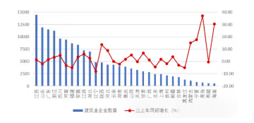 圖 3 2025 年上半年各地區(qū)建筑業(yè)企業(yè)數(shù)量及其增長情況